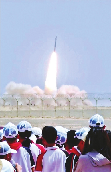 酒泉师范附属学校五年级学生们现场观看火箭发射。 长江日报特派记者胡冬冬 摄
