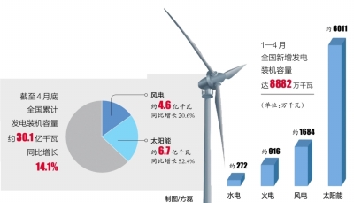 1—4月,全国新增发电装机容量达8882万千瓦,同比增加890万千瓦。其中,水电、火电、风电、太阳能新增发电装机容量分别约为272万千瓦、916万千瓦、1684万千瓦、6011万千瓦。