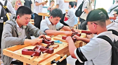 课后服务时段,武汉市十一初级中学的学生们体验做木工活,锻炼动手能力。