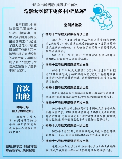 截至目前,中国航天员已圆满完成16次出舱活动。其中,神舟十五号航天员乘组4次出舱并创造了中国航天员单个乘组出舱活动纪录,神舟十七号航天员乘组完成我国首次在轨航天器舱外设施维修任务。