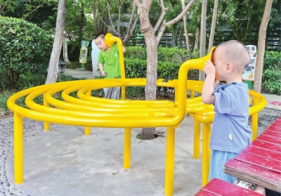 一旁还设置了有趣的“传声筒”,记者测量发现,其高度在1米左右,两个4岁的孩子分别站在两头,一个对着喇叭口说了几句话,另一个在那一头就能听见。
