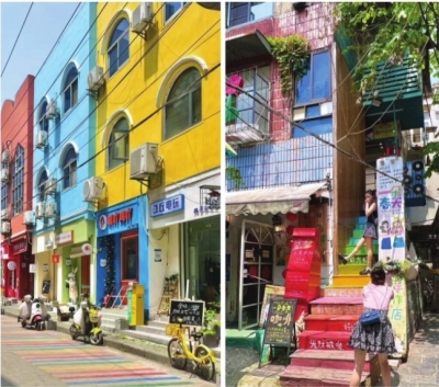 回到家中,我们翻看照片,充满童趣的画面让我们想到童年。于是,我灵机一动,整理了武汉适合我们“做快乐大人”的拍照游玩地:比如昙华林里,有一排彩虹色的房子,色彩鲜丽装饰有趣,看着就觉得心情舒畅。又如武汉人都知道的中山公园,里面有摩天轮、旋转木马、“长江号”小火车,只需要加上胶片感的滤镜,我们就能复刻“重返二十年前”风格的照片;还有拥有绿皮火车的站前花街,老社区里也五光十色……