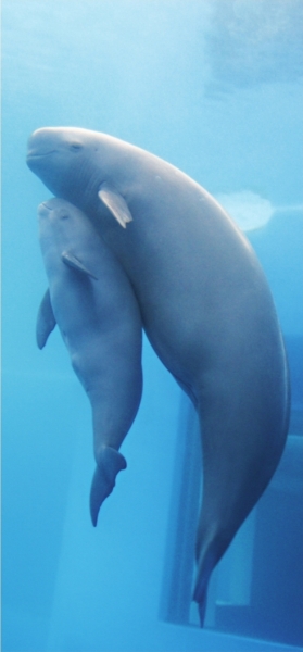 世界第一头在全人工环境中成功繁育的长江江豚“淘淘”与妈妈在水下玩耍。