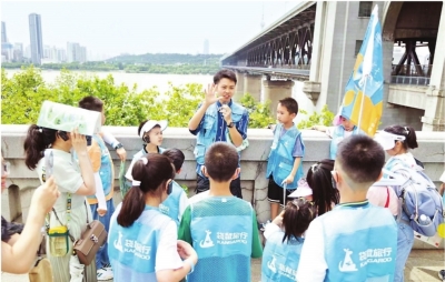 “穿越武汉三千年”武汉城市探索巴士研学课上,讲解员给孩子们讲武汉“桥”的历史。 长江日报记者黄丽娟 摄