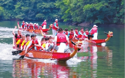 龙舟赛在黄陂木兰天池绿水青山间打响。