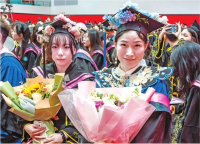 赵静(右)手捧儿子送的鲜花参加毕业典礼。 通讯员吴磊 摄