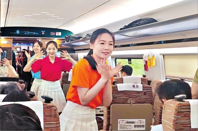 当天上午9时,由武汉站开往深圳北的G875次列车准时出发。长江日报记者走进车厢看到,特色窗花装扮一新,萨克斯演奏、汉服舞蹈、礼仪展示、歌曲串烧等文艺活动精彩上演,工作人员赠送高标运营纪念书签、冰箱贴、钥匙扣等文创纪念品,与旅客互动写下心愿祝福,旅途洋溢着欢乐气氛。