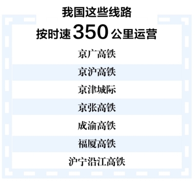 截至目前,我国已有京沪高铁、京津城际、京张高铁、成渝高铁、福厦高铁、沪宁沿江高铁、京广高铁等线路建成安全标准示范线,成功实现常态化按时速350公里高标运营。