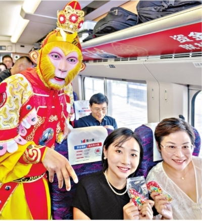 6月15日,在G8388次列车上,演员扮演美猴王为乘客送上纪念品。新华社发