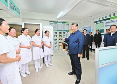 6月19日至20日,中共中央总书记、国家主席、中央军委主席习近平在宁夏考察。这是19日下午,习近平在银川市金凤区长城花园社区党群服务中心社区卫生站同医务人员亲切交流。 新华社记者谢环驰 摄