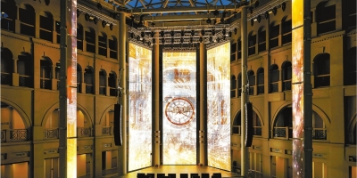 悬吊于场地中心并不断变幻的艺术装置也为塔楼空间增添了活力和艺术氛围,带来巨大的视觉冲击力。艺术装置“星云”贯穿圆堡塔楼主入口,垂直悬浮于空间。2350个互动式光球以灯光的闪烁模拟出想象和希望,每天上演灯光秀6次。艺术装置“繁花盛放”则悬置于圆堡塔楼穹顶之下,是一件融合机械、编程、装饰、光影的综合艺术作品。参观者进入感应区域时,缓慢移动的花瓣会徐徐开合,镜面在灯光照射下不断旋转,将光影投射到周围。民众乐园“转动时钟”早在汉口新市场时期就一直存在,其古典主义风格“诉说”着当年的繁荣景象。如今,在圆堡塔楼5层空间背后,新的电子时钟开始转动。