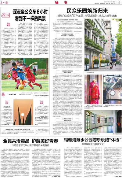 到达百步亭后,我选择原车返回洪山广场。6月22日凌晨2时20分,我再次踏上“旅程”,乘坐4号线公交车前往谭鑫培公园,一路倚窗欣赏武汉夜景。这些白天熟悉的地方在夜色“装扮”下仿佛换上了新装,别有一番风味。文化大道宽阔平坦,高楼灯光璀璨,草木葱茏的绿化带尤为宁静。偶尔拂过的微风也让我感到一种别样的美好。