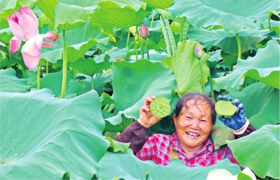 李文三村太空莲产业基地里,莲农开心地采摘莲蓬。