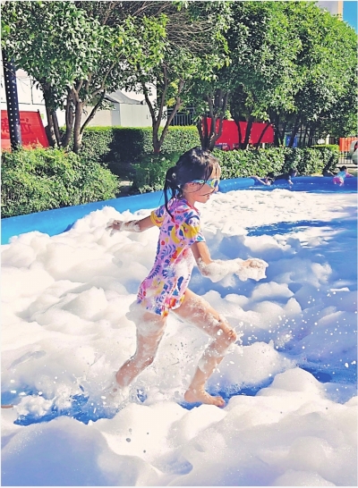 女孩奔跑在水池里,活力满满、快乐一“夏”。