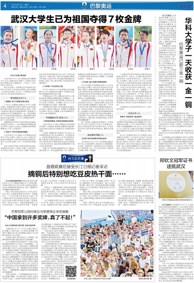 昌雅妮是仙桃人,5岁多开始练习体操,8岁改练跳水,并迅速崭露头角。15岁时入选国家队,开始为国征战。巴黎奥运会是昌雅妮第一次踏上奥运赛场,但她却表现得非常不错。 巴黎奥运会皮划艇静水女子双人划艇500米项目和3年前的东京奥运会一样,中国队继续派出徐诗晓和孙梦雅组成的“金牌组合”出战。作为东京奥运会该项目冠军获得者,两位中国选手的实力优势十分明显。在此前的半决赛中,两人以1分53秒73的成绩位列小组第一晋级决赛。 每逢华科大学子的比赛,学校都会组织在校师生在光谷体育馆观看比赛,为他们加油鼓劲。 在巴黎奥运会的决赛现场,华科大法国校友会组织了后援团,来到现场为郑钦文加油助威。当现场观赛的校友将印有校徽和校名的纸板递给夺冠后的郑钦文时,郑钦文停下了脚步,拿起笔认真地签上了自己的名字,同时不忘和校友拍上一张亲切合影。网友们纷纷感叹,“谁懂这张合影和签名的‘含金量’!”