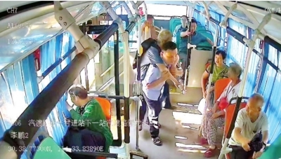 8时51分,车辆到阳光大道阳逻中队站,老人准备下车。李鹏一边停车起身,一边对老人说:“您慢一点,我来帮您!”他快步来到老人身旁,先将老人的拐杖和行李箱拿下车,再跑步上车,小心翼翼地把老人背下车。然后,他招呼老人拿好行李,拄好拐杖,提醒老人“天气炎热,注意安全”后,才安心返回工作岗位。
