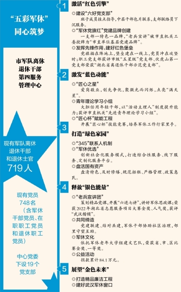 陈睿介绍,中心聚焦军休服务管理主责主业,在军休干部教育管理、服务保障、优势作用发挥等方面打造匠心臻品、升级水平,满足军休干部对美好生活的向往,引导他们为武汉经济社会发展服务,为英雄城市高质量发展贡献军休力量。