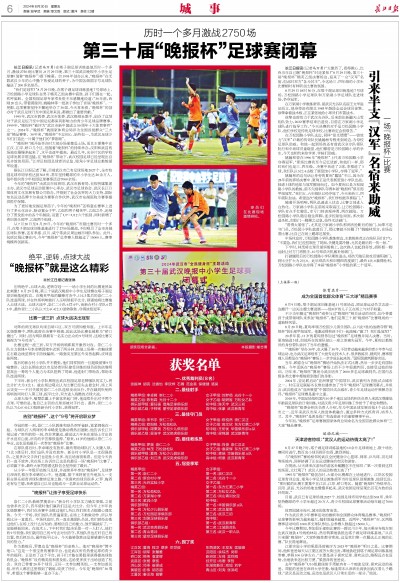作为武汉青少年赛事活动的旗帜和全国群众体育精品赛事,“晚报杯”足球赛的影响力越来越大,辐射面越来越宽。近两年,“晚报杯”市、区两级赛事活动均有1000多支球队参加,总参赛人数超过15000人。