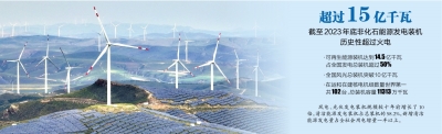 ——清洁能源发展实现新跨越。截至2023年底,风电、光伏发电装机规模较十年前增长了10倍,清洁能源发电装机占总装机的58.2%,新增清洁能源发电量占全社会用电增量一半以上。清洁能源消费量占能源消费总量的比重从15.5%提高到26.4%,煤炭消费比重下降12.1个百分点。