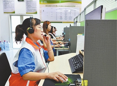 湖北武汉12355青少年服务热线专家坐席阮宏君正在接线。
