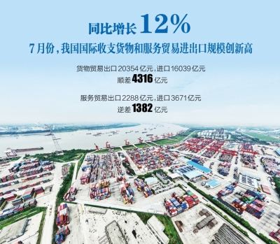 其中,货物贸易出口20354亿元,进口16039亿元,顺差4316亿元;服务贸易出口2288亿元,进口3671亿元,逆差1382亿元。按美元计值,2024年7月,我国国际收支货物和服务贸易出口3175亿美元,进口2764亿美元,顺差411亿美元。