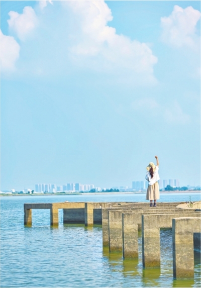 黄陂武湖,水天一色,一名女孩在湖边眺望远方。