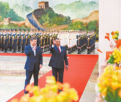 9月6日上午,国家主席习近平在北京人民大会堂同来华出席中非合作论坛北京峰会并进行国事访问的刚果(布)总统萨苏举行会谈。这是会谈前,习近平在人民大会堂北大厅为萨苏举行欢迎仪式。
