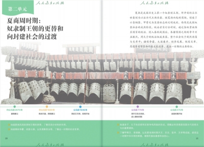 记者看到,七年级(上册)中国历史教材第二单元介绍夏商周时期内容时,曾侯乙编钟的照片跨第20和21两个页面,第49页《知识拓展》栏目图文并茂地又做了介绍。书中介绍,1978年,湖北随州曾侯乙墓出土了一整套战国时期的编钟,全套共65件,上有铭文3700多字。这是我国迄今发现的保存最好、音律最全、音域最广、气势最宏伟的编钟,至今还能演奏。