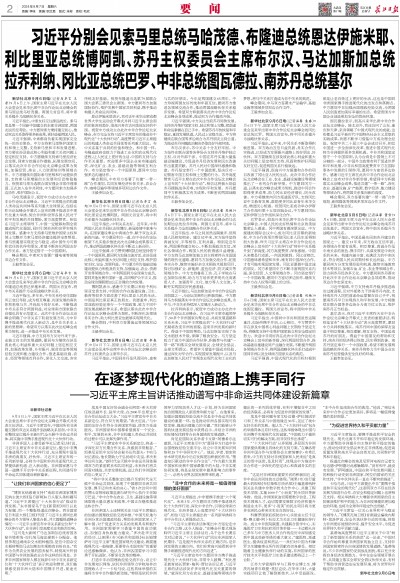 习近平主席提出,中非要携手推进“六个现代化”。未来3年,中方愿同非方携手推进现代化十大伙伴行动,深化中非合作,引领全球南方现代化。非洲多国人士高度评价“十大伙伴行动”,相信习近平主席提出的一系列新举措将为非中合作注入更强劲动力。