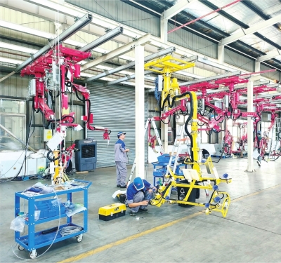 9月4日上午,长江日报记者走进位于武汉经开区的武汉孚锐利,焊接区、装配区、调试区一派繁忙。调试区内,多名技术人员正在为一字排开的各种机械臂做出厂前的最后检测。据悉,这些机械臂是杭州钱塘某新能源工厂总装需要的所有助力设备。