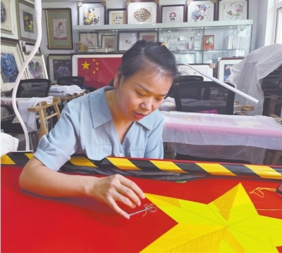 我从小喜欢画画和绣花等一些手工活,可喜欢顾老师工作室里的汉绣作品了,我自己绣的两个京剧脸谱受到了顾老师的表扬。这次绣国旗心里挺激动的,毕竟国旗代表着国家,绣国旗是一件严肃的事。作为一名普通社区居民,能有机会参加绣制神圣的国旗,心里感觉很荣幸。能通过绣国旗为视力障碍人士做一点实事,为祖国奉献一份力量,我感到欣慰和自豪。