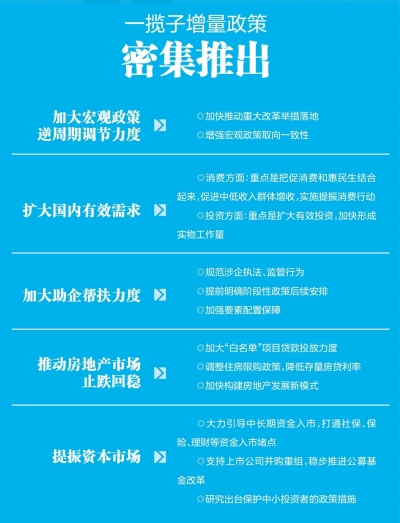 “贯彻落实一揽子增量政策,是项综合性、系统性工作,要提高针对性和精准性,增强有效性和可持续性。”郑栅洁说,要针对经济运行中的下行压力,强化宏观政策逆周期调节;针对国内有效需求不足等问题,把扩内需增量政策重点更多放在惠民生、促消费上;针对当前一些企业生产经营困难,加大助企帮扶力度,切实优化营商环境;针对楼市持续偏弱,促进房地产市场止跌回稳;针对前期股市震荡下行等问题,努力提振资本市场。