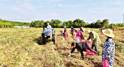 10月10日一大早,胜丰村红薯产业基地里热火朝天。随着自动化收割机的轰鸣声,一垄垄饱满的红薯破土而出,齐刷刷排列在田间地垄上,村民们忙着给新出土的红薯去泥、分拣、装袋。