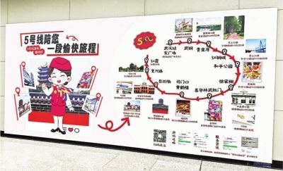 那天,我们乘地铁5号线来到司门口黄鹤楼站,刚准备出站就被一个超大的宣传展板吸引,上面写着“5号线陪您一段愉快旅程”。展板上醒目的字句和好看的设计让我产生了好奇。我走近一看,展板上标注了地铁5号线沿途许多好玩的地方,有公园、江滩,还有粮道街、大成路、昙华林,甚至还贴心地标注了具体点位和路线,比如“粮道街:司门口黄鹤楼站C口约100米”“青山江滩:和平公园站D口约1600米”“四美塘公园:徐家棚站S口约700米”。这些都是我早就想打卡的地方,它们竟然可以通过一条地铁线路轻松到达。