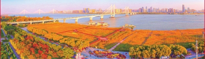 秋日的汉口江滩层林尽染,漫江碧透,一派人与自然和谐共生的壮丽景象。