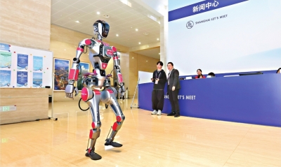 11月3日在第七届进博会新闻中心一楼拍摄的咨询服务人形机器人“小新”。当日,设置在国家会展中心(上海)的第七届进博会新闻中心对中外媒体记者开放。