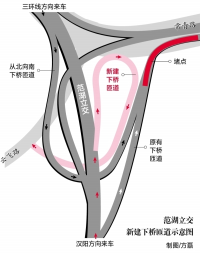 据了解,宝丰路高架汉阳至汉口方向在范湖立交原本有一条通往江汉区常青片区、王家墩商务区、汉口火车站的匝道,匝道由宽3.7米的车道和一条应急道组成,在抵达地面路段时又与从北向南方向下来的匝道汇成一条路,早晚高峰车流增大,导致匝道经常堵车。由于宝丰路高架由南向北范湖立交早高峰拥堵情况较为严重,被列为武汉市骨架路网重大堵点路段之一。