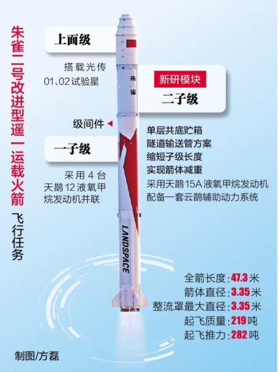 朱雀二号改进型遥一运载火箭采用两级构型,各级均使用液氧甲烷推进剂。全箭长度47.3米,箭体直径为3.35米,整流罩最大直径3.35米,起飞推力约282吨,500公里太阳同步轨道运载能力可达4吨。