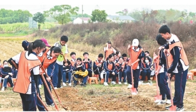 割稻打谷后,同学们深入田地中进行犁地翻地。放铲、脚踩、翻土……这些看似轻松的动作,实际上做起来却十分困难。学生小方说,开垦从来都不能轻易理解成“挖土”,对于下铲的位置和力度,都需要多次操作后,才能熟悉和掌握。