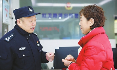 崔家芝在红卫路派出所感谢帮她找回金手链的民警胡永鹏。