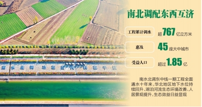 10年来,南水北调东线一期工程水质持续稳定达到地表水Ⅲ类、中线一期工程保持在Ⅱ类及以上。通过水源置换和河湖生态补水等措施,华北地区地下水水位总体回升,永定河等众多河湖重现生机。