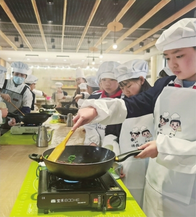 在烹饪教室里,学校食堂大厨带领学生们亲手烹制清炒菜薹。