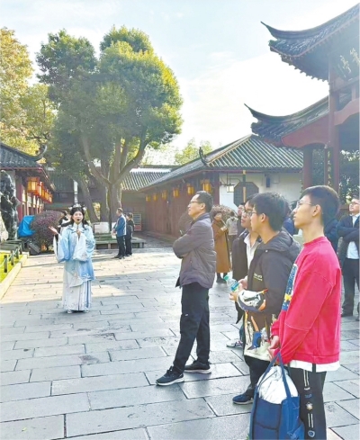古风志愿讲解员在黄鹤楼公园搁笔亭前讲解。