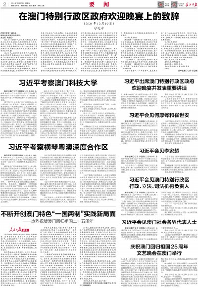 (上接第一版)澳门作为祖国大家庭一分子,要在新时代新征程展现新担当新作为,为强国建设、民族复兴伟业作出更大贡献。我坚信,在习近平主席亲切关怀和中央政府的大力支持下,第六任行政长官岑浩辉先生必将带领新一届特别行政区政府和社会各界,谱写出具有澳门特色的“一国两制”实践新篇章。