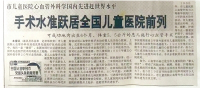 1992年5月31日,长江日报头版头条刊发报道《市儿童医院心血管外科学国内先进赶世界水平 手术水准跃居全国儿童医院前列》,介绍医院的探索经验。