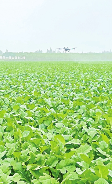 富邦科技在湖北潜江的圆颗粒钙镁磷肥应用推广示范基地内,无人机正在作业。
