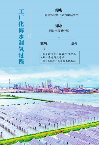 项目采用工厂化运行方式,利用青岛炼化水上光伏电站生产的部分绿电,通过电解槽将海水分解为氢气和氧气,所产氢气并入青岛炼化管网,用于炼化生产或氢能车辆加注,生产过程完全在工厂内进行。