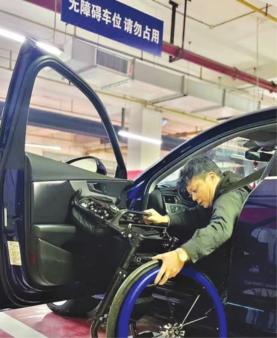甘迅将轮椅从副驾驶座拿到驾驶室外。