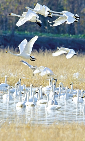 从密布的“渔网”到翱翔的“翅膀”,经过了7年的持续保护。目前,经过黄盖湖湿地越冬候鸟已超4万只,包括国家一级保护野生动物白鹤、黑鹳,国家二级保护野生动物小天鹅、鸿雁、灰鹤、白琵鹭等。
