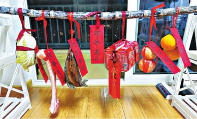 正当我惊喜之时,最搞笑的一幕出现了:她们的丈夫扛着一根一米多长的甘蔗,蹦跶着出场。甘蔗上挂着不同物件,包括一刀肉、两个橙子、两个苹果、一条鱼、一箱可口可乐饮料等。物件上附有写着不同词语的牌子,比如甘蔗上挂着“节节高升”、猪肉上挂着“诸事皆宜”、橙子上挂着“心想事成”……我笑得眼泪都流出来了。